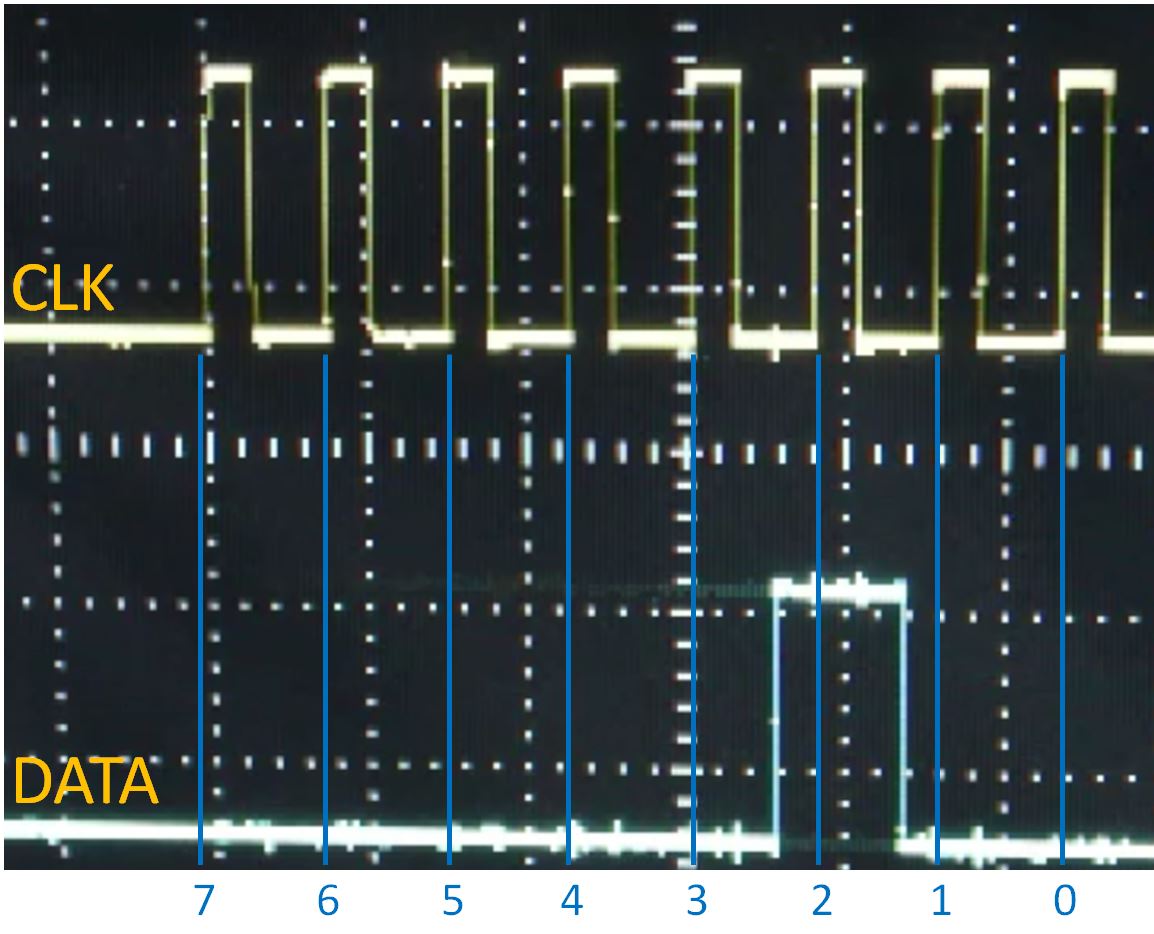 The following picture shows an example in which output 2 is set high (i.e. only motor 1 connected to Out2 will be switched on). The data line is sampled at each rising edge of the clock.